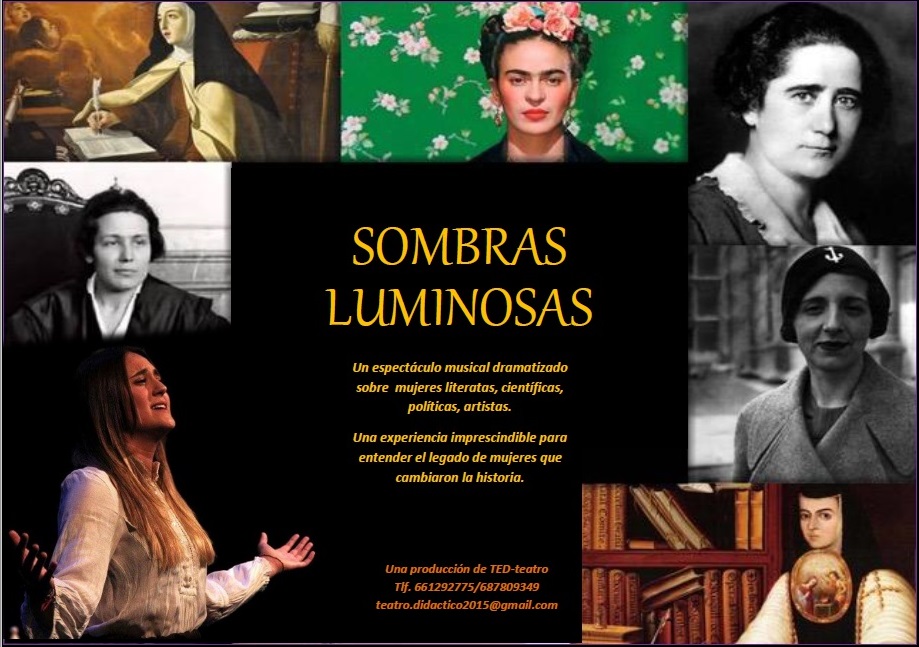 SOMBRAS LUMINOSAS Un recorrido musical y teatral por las figuras de mujeres que brillaron con luz propia. Santa Teresa de Ávila, Sor Juana Inés de la Cruz, Clara Campoamor, María Zambrano, Frida Kahlo, Victoria Kent, las Sinsombrero…